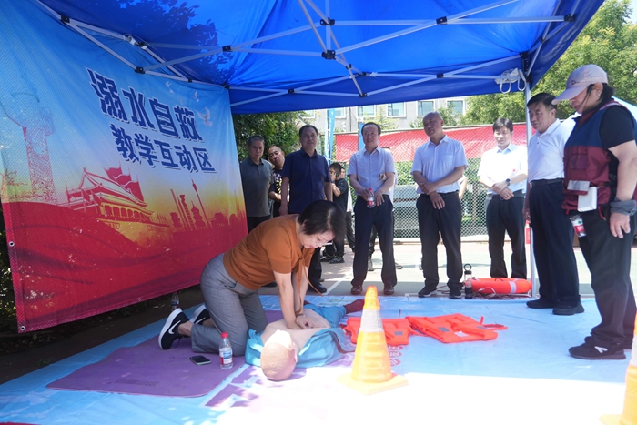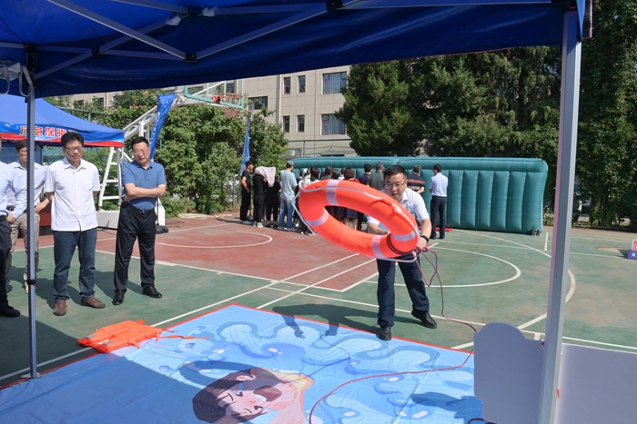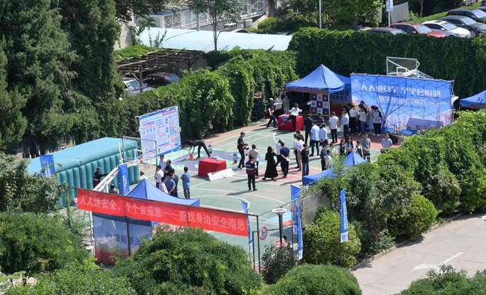 演練結(jié)束后,舉辦方在大廈籃球場開啟安全咨詢體驗活動。整個活動共設(shè)置了6個項目,分別為擁擠踩踏應(yīng)急處置體驗區(qū)(充氣帳篷)、消防隱患排查試驗區(qū)、電動車電池穿刺爆燃體驗裝置、溺水自救互救教學培訓(xùn)區(qū)、醉酒交通AR模擬體驗、安全標志互動區(qū)。活動現(xiàn)場氣氛熱烈,盡管天氣炎熱,但絲毫沒有減弱大家體驗掌握應(yīng)急技能的熱情。